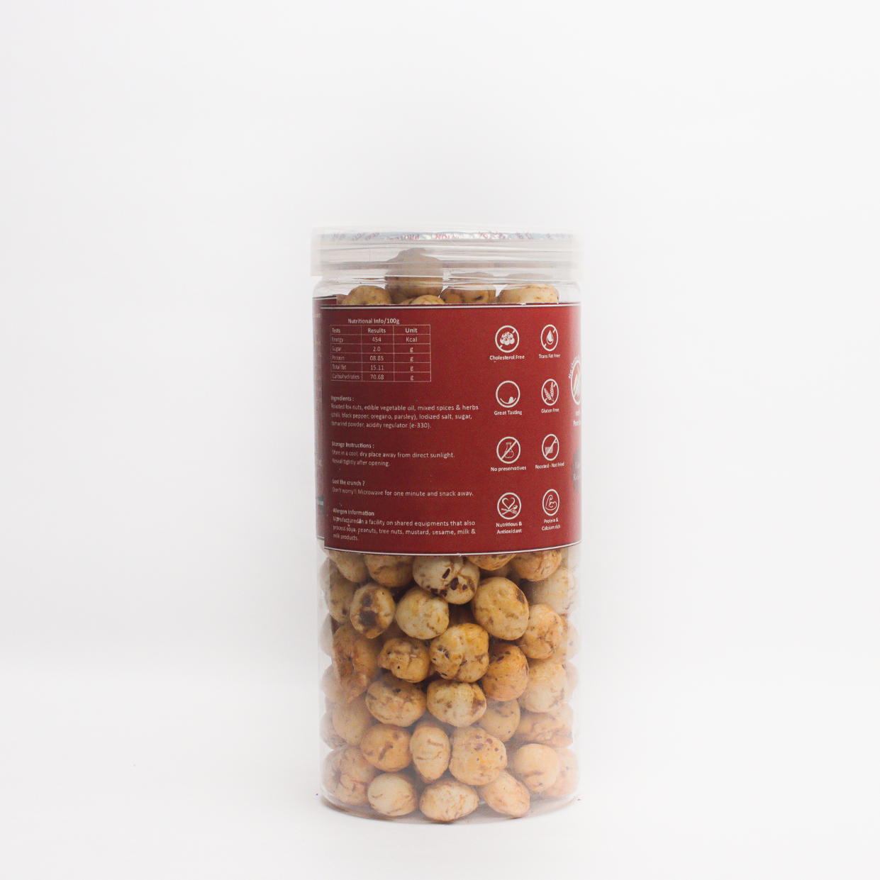 Roasted Fox Nuts, Edible Vegetable Oil, Chilli, Black Pepper, Oregano, Parsley, Lodized Salt, Garlic Powder, Onion Powder, Sugar, Tamarind Powder, Acidity Regulator.